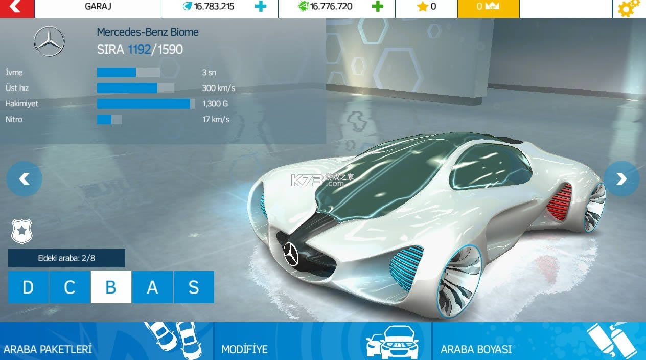3. 积累的奖金越多可以购买的车辆选择也多,并且可以进行升级改装,提升赛车各项性能。