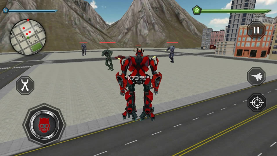 《变形金刚空战(air robot transformation)》是一款机甲格斗类的游戏,玩家能够操作变形金刚在城市之中来消灭掉其他邪恶的机甲,机甲还能够切换成飞机形态来进行战斗,应对空中的敌人。