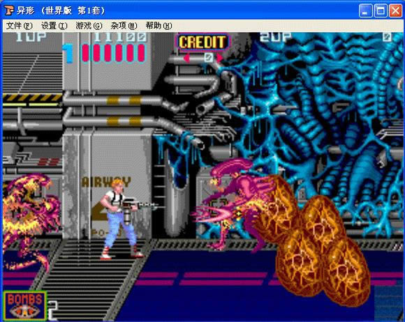 街机横版动作射击游戏,2条命每条命8滴血。杀光所有异形。