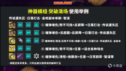 在安全身位:利用后膛发射榴弹、金枪枯萎囤积、或者金枪混乱无序,触发赛季模组DEBUFF给火力小队提供增伤,然后切枪输出非常暴力,是单刷地牢、金枪任务副本、宗师日落和开荒VOG可能的利器