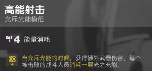 这是萌新一开始就可以使用的最简易的bd了,带上一个电池武器,通过引爆电池就可以对大范围的敌人造成伤害,并且拾取光球叠加充能层数,触发高能射击,可以获得一个长时间的持续增伤(高能射击的增伤是无限持续的,直到你使用武器把敌人击败,击败敌人就会消耗一层充斥光能的层数,一开始充斥光能只能堆叠两层)。