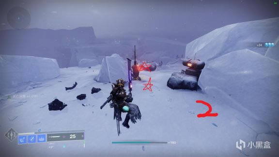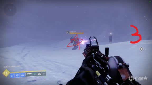 3.在暴风雪不强的时候可以站在高处(例如上面的观察点)然后玩下手机整理下装备什么的,然后等暴风雪强起来之后注意左下角,一旦有系统旁白提示重要目标蠢蠢欲动/在附近徘徊,这时立刻去刷怪点一个个找,例如废墟那里从观察点下来去一号点看然后去二号点,接着三号点,从观察点出发,正好是一个逆时针的路线。