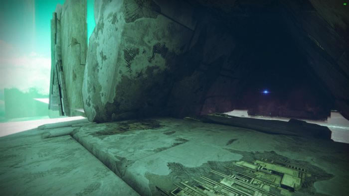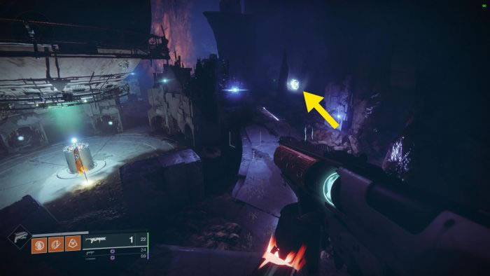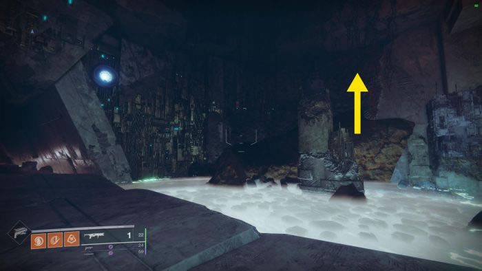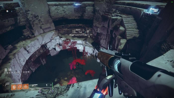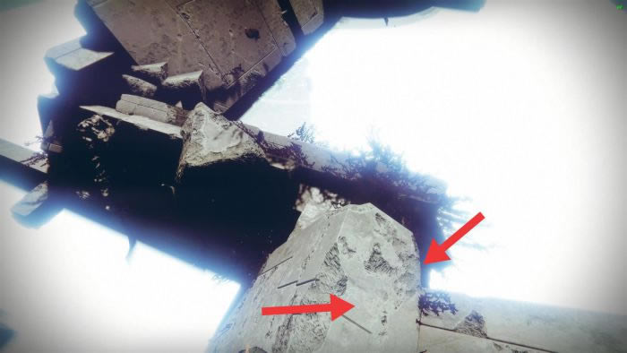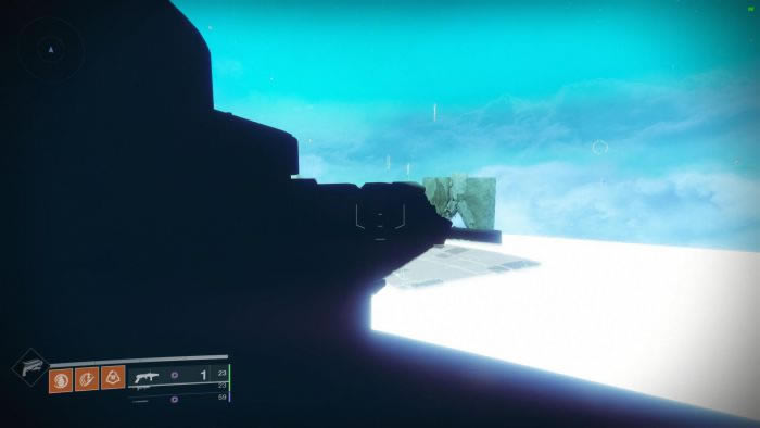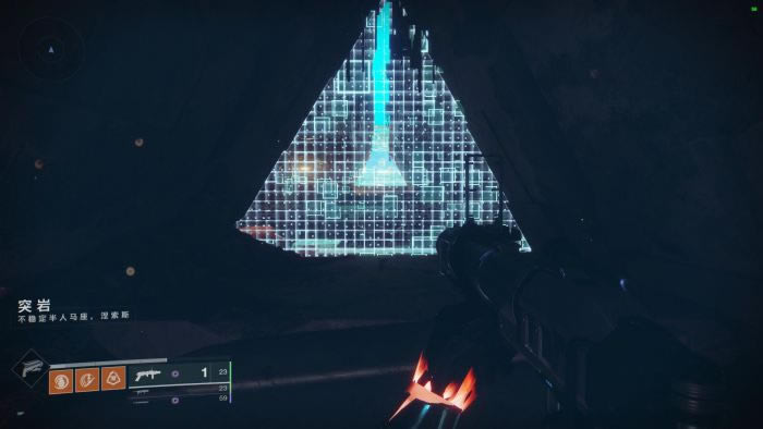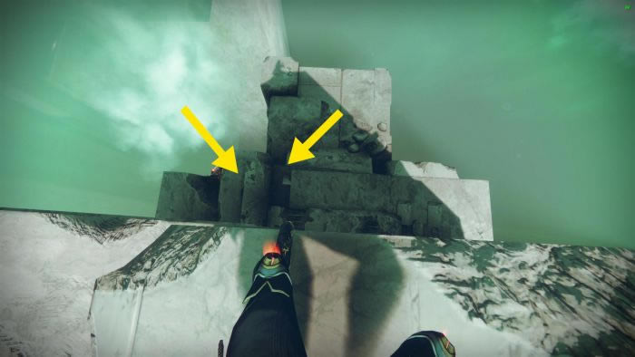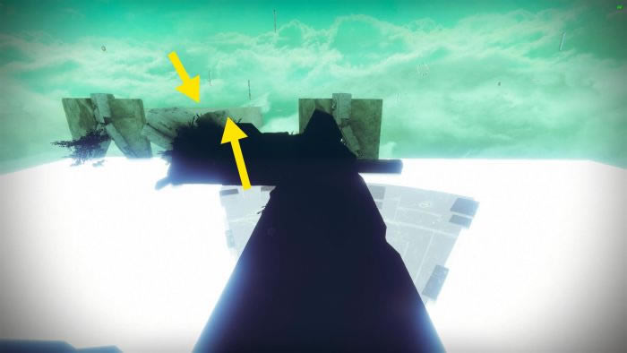 走到这个棱柱状走廊的正面是这样的,它中间有个凹陷,小心别掉下去了。然后沿着这个棱柱的任意一个斜面走到这个走廊的尽头,再跳到图中箭头所指的位置。如果中间不慎因为各种意外情况死亡,有很大概率会刷出一堵墙在你的地图上,你就只能回到神器止境刷新地图再过来啦