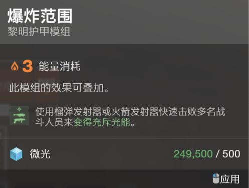 大家都知道,充斥光能条件对于没有大量大师武器的咸鱼来说相对较困难,而在目前赛季人均山巅的情况下,爆炸范围这个模组可以让我们不需要特定属性破盾或者拾取光球就可以增加一层光能buff。