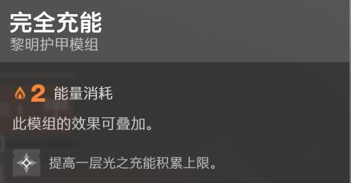 而完全充能这个模组,能让初始的两层充斥光能buff增加一层,让光能buff使用积累量更多。