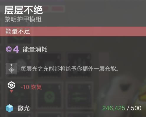 而层层不绝可以让你充能的效率翻倍,这就使得不需要过多的充能模组就足够让你一次性堆满初始的两层充斥光能buff,但是因为会有属性惩罚,所以这个模组酌情考虑。