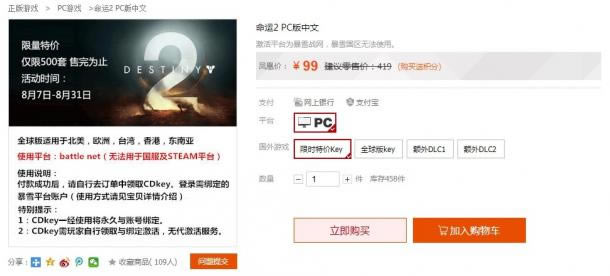 需要注意的是,本次限时特价为亚洲版key,暴雪国区无法使用,激活平台为暴雪战网。中国大陆地区的玩家如何使用《命运2》亚洲版Key的可以参照商城地址下的教程。