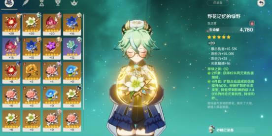5件圣遗物选择,毕业风套 4件套减少抗性 (有缺点后面说) 或者 2乐团+80精通+ 2风花选择。