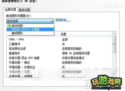 2、N卡用户进入NVIDIA控制面板,“管理3D设置”里面,在“全局设置”l里设置首选图形处理器为“高性能NVIDIA处理器”