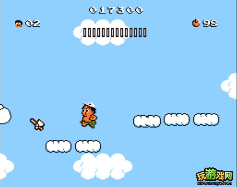 1-B是空中关,这一关一开始就有隐藏物品,在最右面跳一下,就获得一个表(可以把敌人暂停)