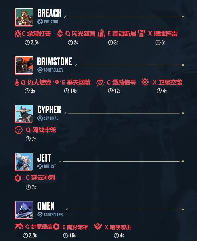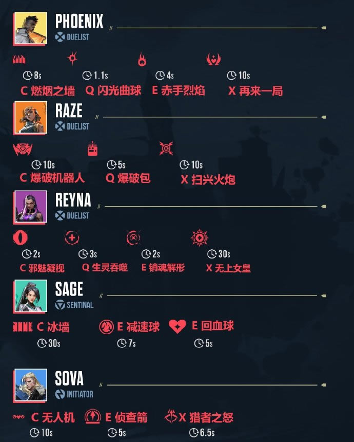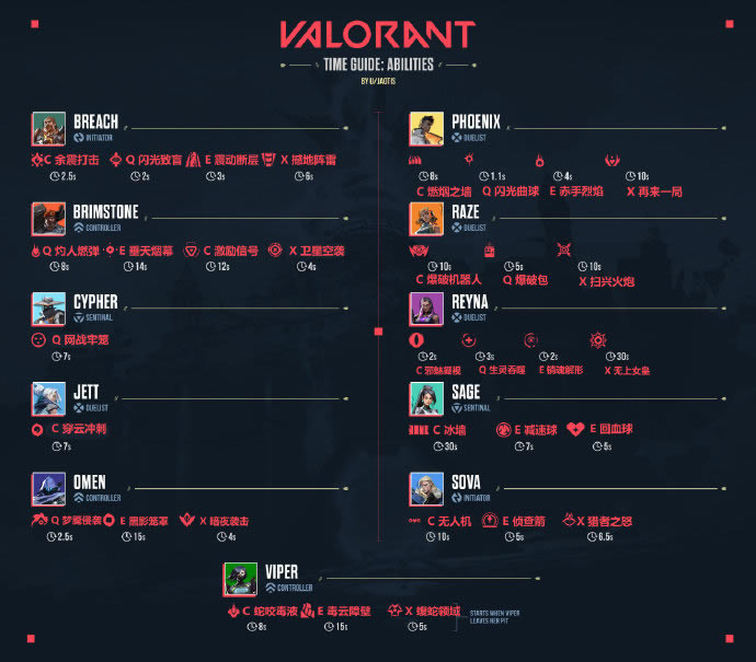 Valorant无畏契约中特工都有各自的技能,且每个技能的持续时间都不一样,那么这些特工的技能具体持续时间是多久呢,下面就给大家带来Valorant无畏契约全特工技能持续时间表一览,以供玩家参考。