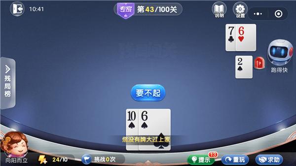 攻略:这一关我们首先就是要把对方的王炸打下来,然后不要让对方的小牌溜了就行了。