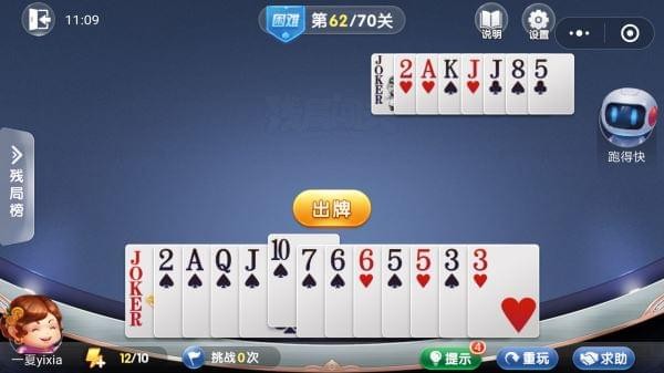 欢乐斗地主残局困难62关怎么过?微信欢乐斗地主残局闯关玩法困难模式的第62关手牌为大王2AQJ107665533,本关我方手牌中对牌居多,而对手没有这个优势,再加上大单牌对手与我方一样,所以本关很简单,下面就让我们一起来看下,微信欢乐斗地主困难残局第62关攻略。